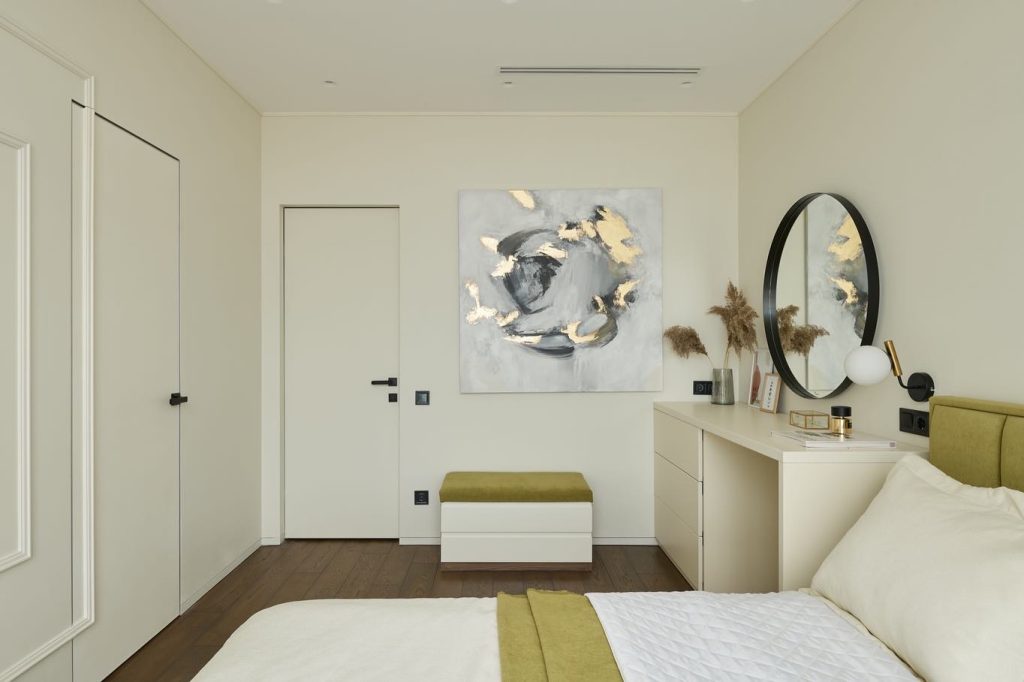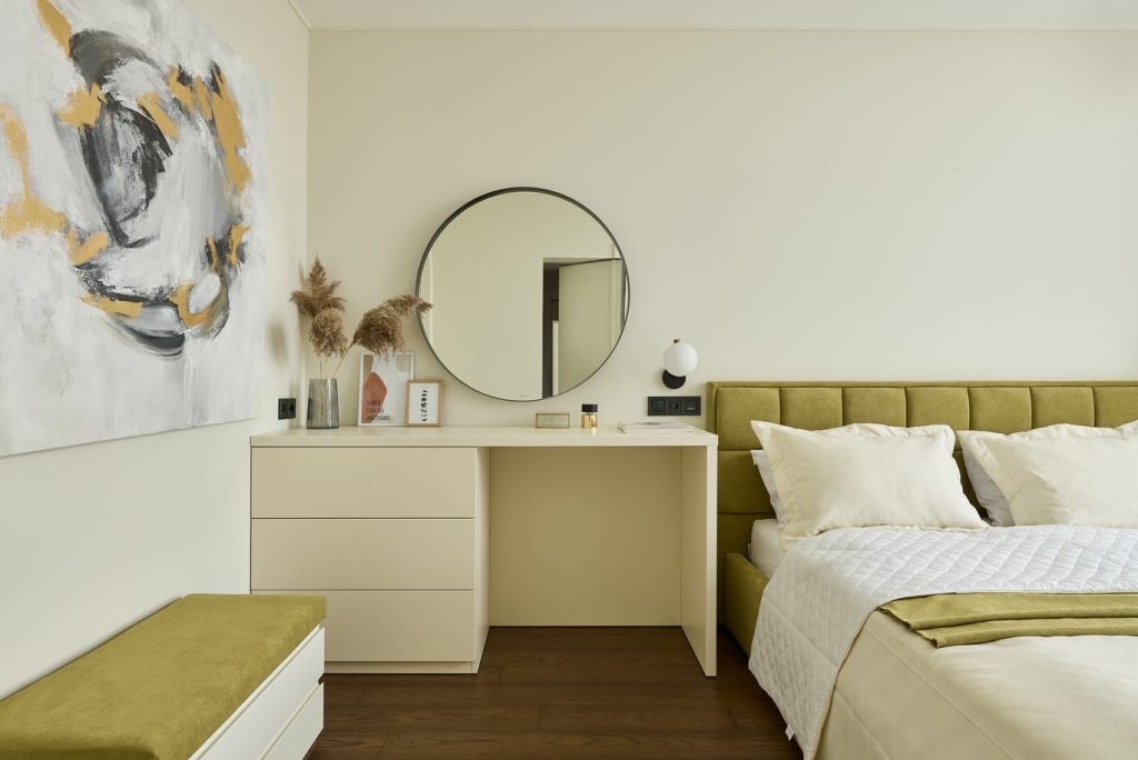 Este dormitorio fue concebido como un refugio personal donde la serenidad lo envuelve todo. Los tonos neutros, la textura natural del lino y los acentos en verde oliva crean una atmósfera acogedora y elegante. Cada elemento —desde el cabecero capitoné hasta el tocador minimalista con espejo circular— ha sido seleccionado cuidadosamente para transmitir armonía sin renunciar a la personalidad.