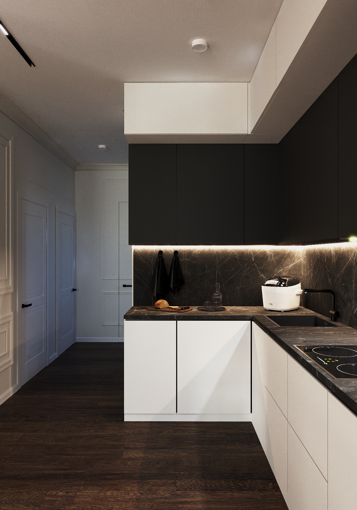 Materiales destacados: Mármol negro veteado, acabados mate, iluminación empotrada