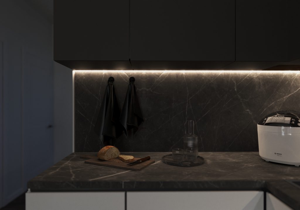 La iluminación LED cálida bajo los muebles altos aporta profundidad y realza las texturas sin invadir la atmósfera. Todo está medido: sin tiradores, sin exceso, solo líneas puras y materiales nobles. Cada rincón transmite orden, calma y precisión.