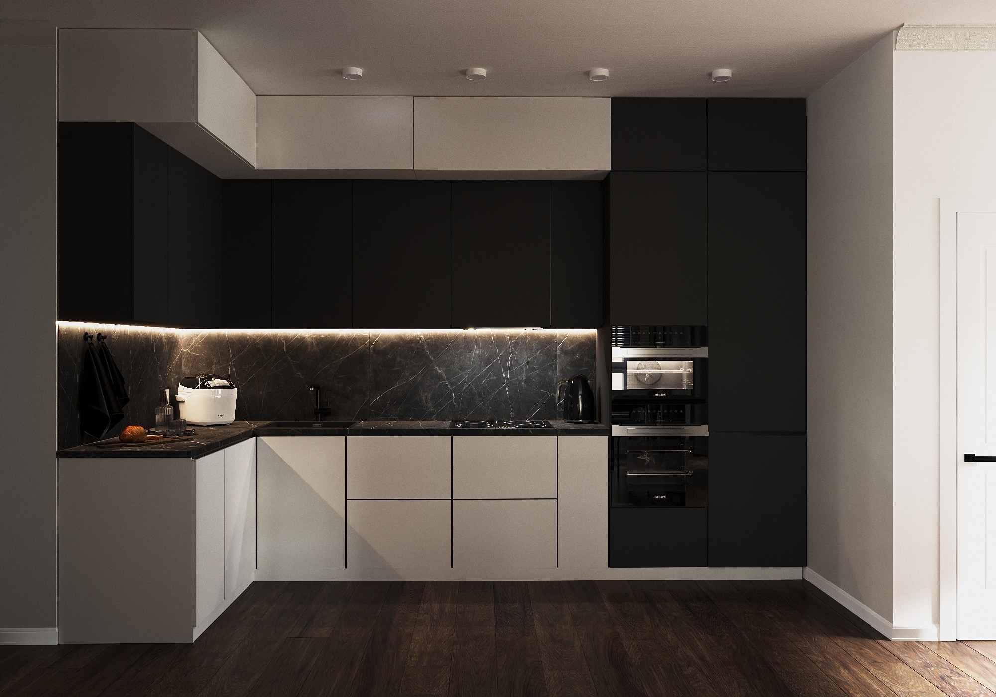 Proyecto Onix representa la máxima expresión del minimalismo sofisticado. Una cocina donde la oscuridad no es ausencia de luz, sino una declaración de carácter. El contraste entre el negro profundo de los muebles altos y el blanco mate de los bajos genera una geometría limpia y atemporal, realzada por el veteado dramático del mármol oscuro.